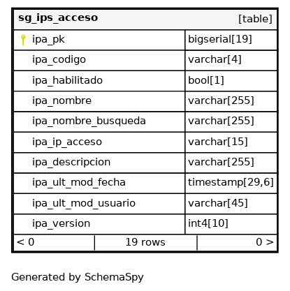 | ipa_pk | bigserial | 19 | √ | nextval('catalogo.sg_ips_acceso_pk_seq'::regclass) |